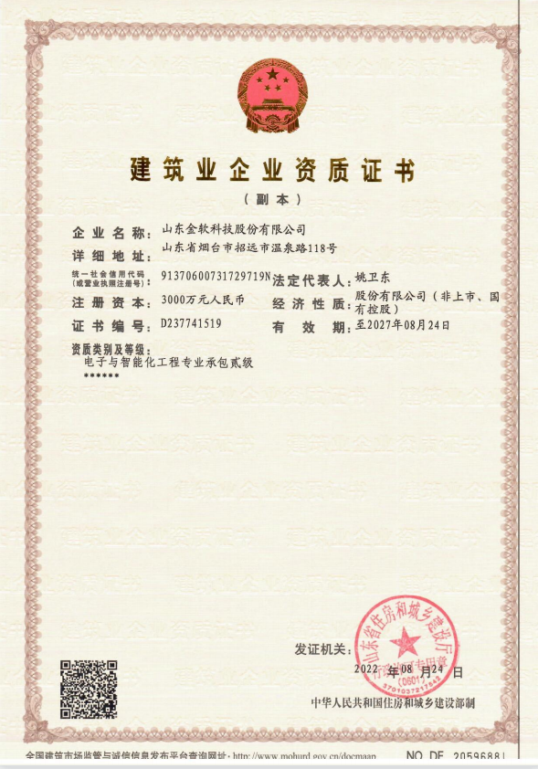 近日,經(jīng)山東省住房和城鄉(xiāng)建設(shè)廳批準(zhǔn),山東金軟科技股份有限公司順利取得“電子與智能化施工貳級資質(zhì)”,此