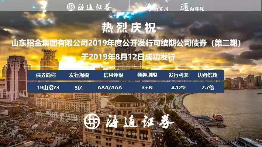 2019年8月12日,山東招金集團有限公司成功發(fā)行5億元三年期可續(xù)期公司債券。本次票據發(fā)行票面年化利率較三年